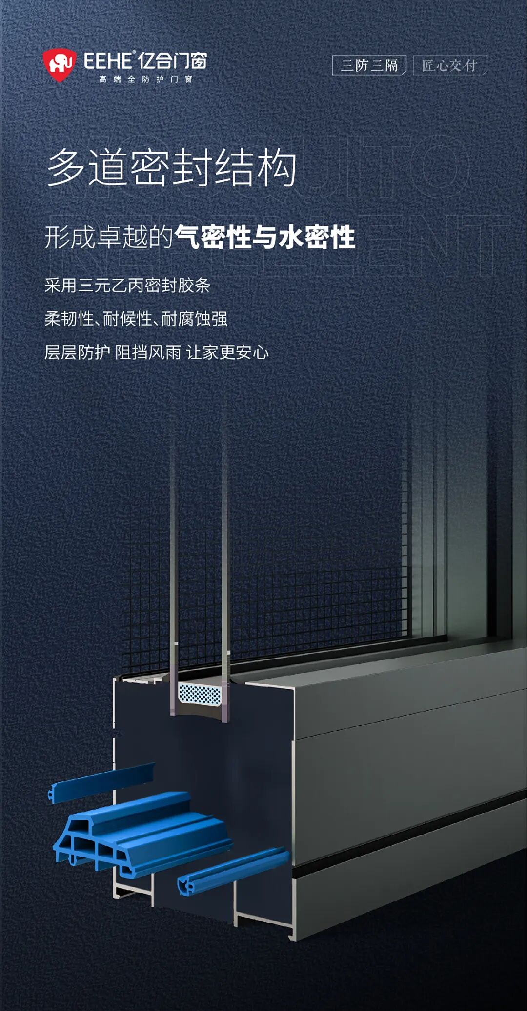 門窗的密封性是隔絕冷風的第一道防線。億合門窗采用具有高柔韌性、耐氧化、耐腐蝕能力的三元乙丙密封膠條,通過層層防護形成嚴密的多道密封系統,有效阻擋風、灰塵和雨水的侵入。秋日的風常夾雜落葉與灰塵,有了億合門窗的嚴密守護,室內始終能保持潔凈清爽,無需頻繁打掃;即便遇到秋雨綿綿,也不用擔心雨水滲漏,讓家始終維持干燥舒適的環境。