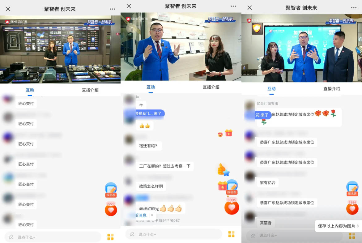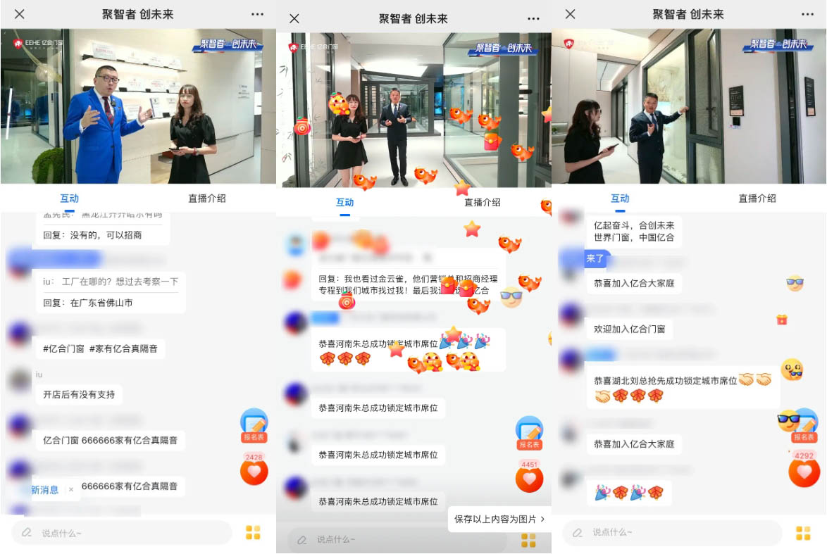 憑借著強大的品牌力、產品力、營銷力及優惠的加盟政策、完善的扶持體系,本次億合門窗線上直播招商會吸引眾多客戶咨詢加盟、持續轉化。這不僅是對億合門窗產品創新與品牌魅力的一次展示,更是連接了來自全國五湖四海的合作伙伴,搭建了一個互利共贏的廣闊平臺,標志著億合門窗的全國版圖正火熱擴張。