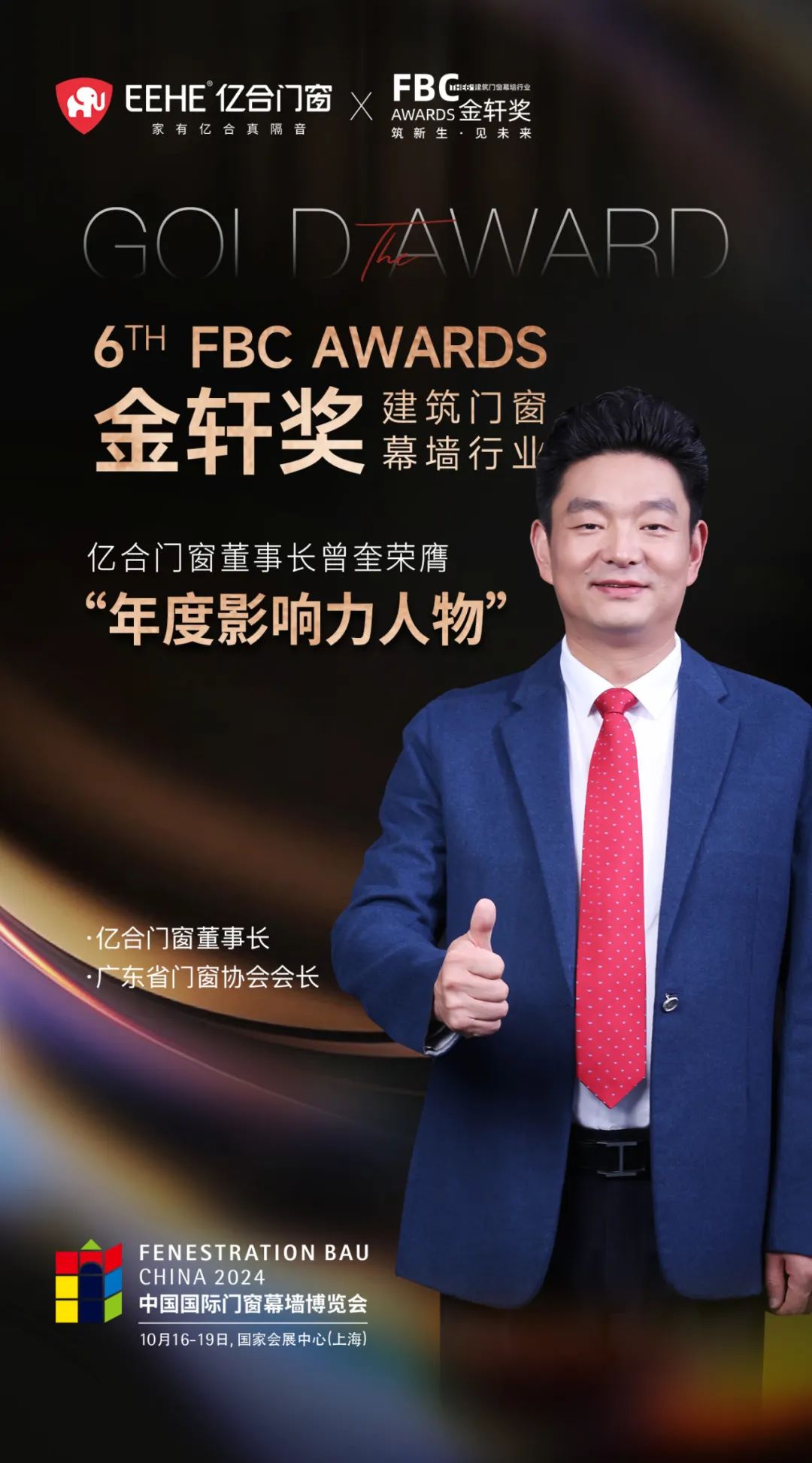10月15日,FBC之夜暨第六屆金軒獎頒獎盛典在上海虹橋綠地鉑瑞酒店盛大舉辦,億合門窗董事長曾奎受邀出席盛典。在這場匯聚眾多行業精英的盛會中,億合門窗憑借卓越的綜合實力和持續不斷的創新動力脫穎而出,榮獲“家裝系統門窗品牌TOP榜”、“建筑門窗安裝示范單位”兩項重量級獎項。此外,曾奎董事長榮膺“年度影響力人物”這一殊榮,不僅是對他個人卓越成就的肯定,更是對億合門窗在推動中國門窗行業發展、提升行業整體水平方面作出杰出貢獻的高度認可。