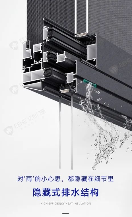 同時搭配隱藏式排水設計,依據等壓腔原理,保證水體的自由流動,杜絕倒灌現象,即使在暴雨天,也能使排水更加流暢,進一步保證門窗的水密性。