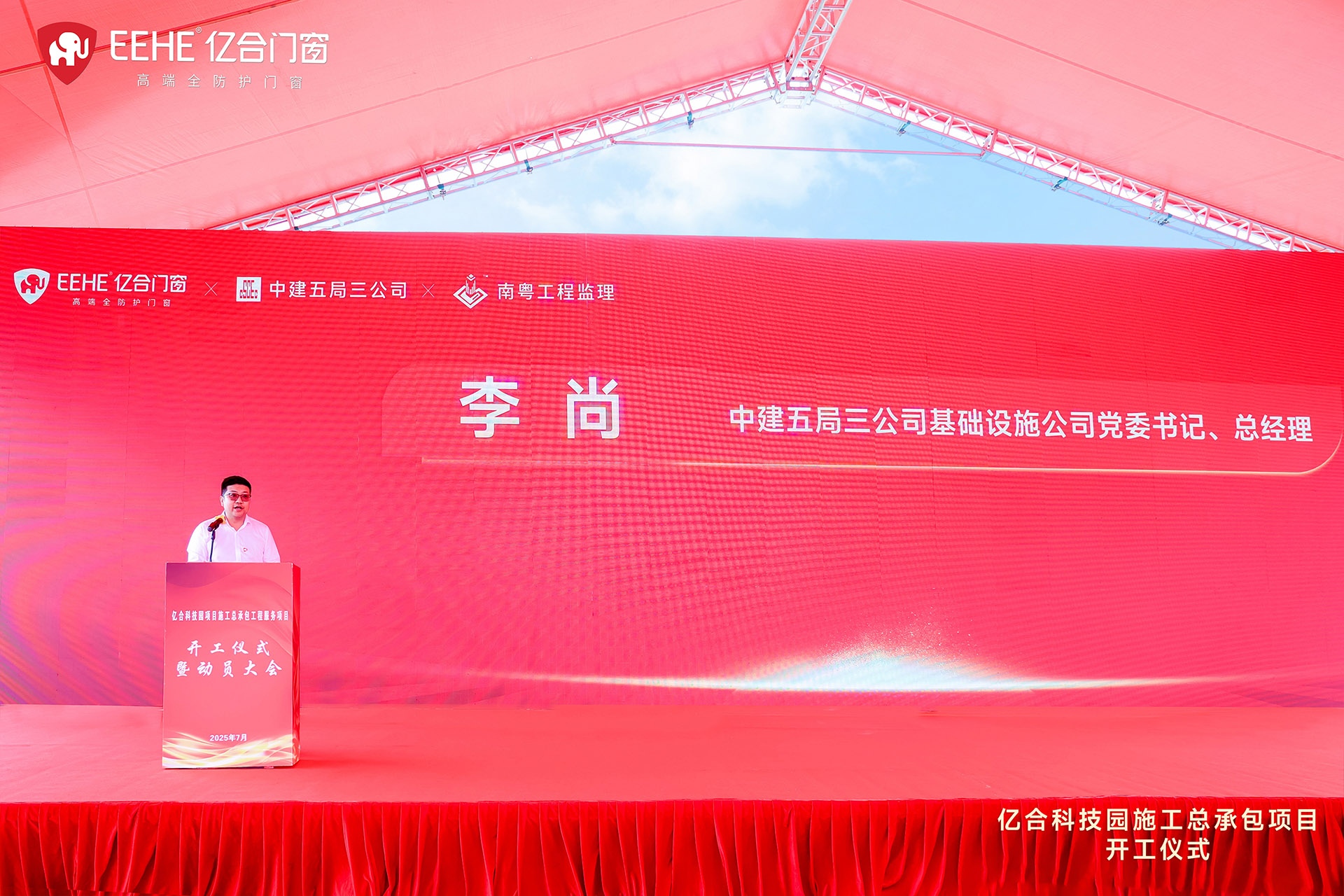 中建五局三公司基礎設施公司黨委書記、總經(jīng)理李尚在講話中表示,作為項目承建方,參與億合科技園項目建設使命光榮、責任重大。中建五局三公司將堅持“以客戶為中心”、“以項目為中心”的管理理念。從前期策劃到竣工驗收,從重大節(jié)點到日常施工協(xié)調(diào),提供全天候、全方位服務,建立高效順暢的溝通機制,及時滿足項目需求,助力億合科技園早日建成投產(chǎn),必將把億合科技園項目打造成為質(zhì)量一流、技術(shù)領(lǐng)先、綠色智能、安全高效的精品工程,樹立區(qū)域高端門窗產(chǎn)業(yè)基地新標桿。并以此為依托,為推動當?shù)禺a(chǎn)業(yè)升級、集聚配套資源、促進區(qū)域經(jīng)濟高質(zhì)量發(fā)展貢獻積極力量。