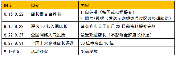 ② 報名要求:以門店為單位,每家門店推薦1名店長,參賽店長于8月22日前提交自薦書,具體表格,找本區域的區域經理索要。