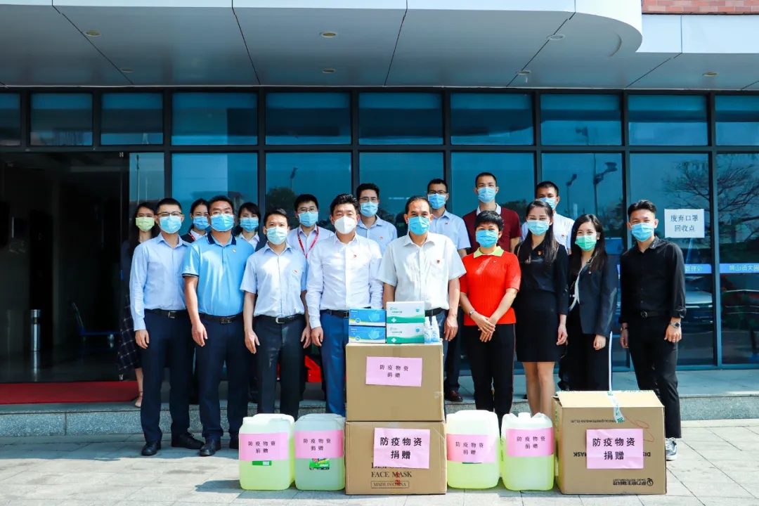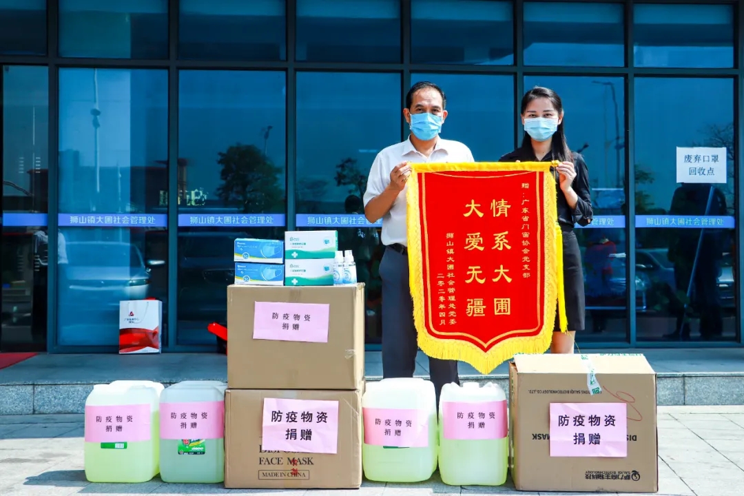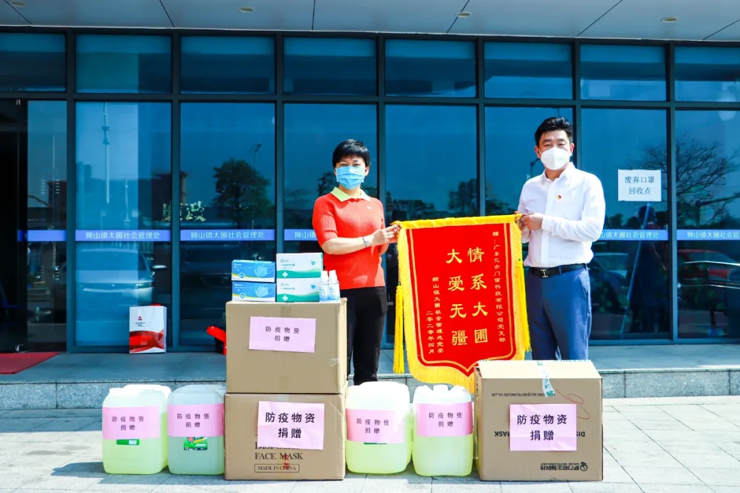 交流聯誼會結束后,三位支部書記和黨員代表共同前往獅山鎮大圃社會管理區開展走訪活動,并向大圃社會管理區防疫物資捐贈。