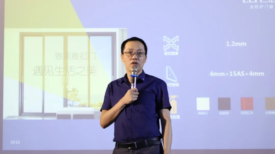 億合門窗商學院院長胡敏以專業的產品知識向在座的家人講解億合新品的核心賣點、市場主流競品分析、技術研發性能三大產品模塊內容。