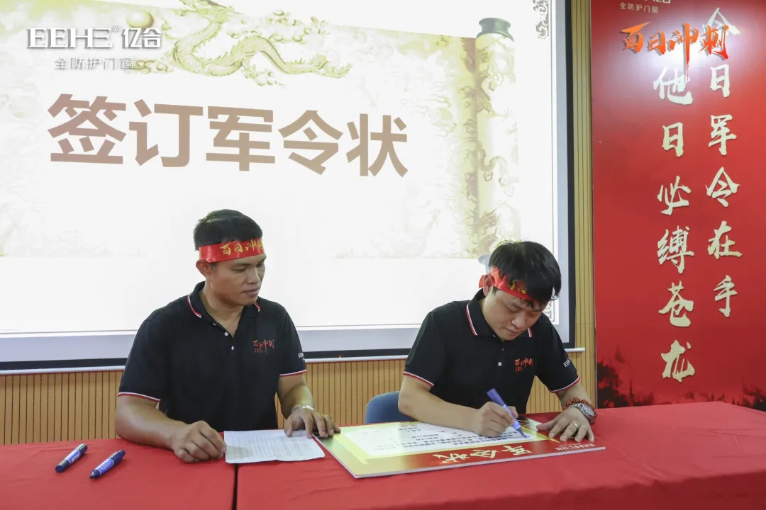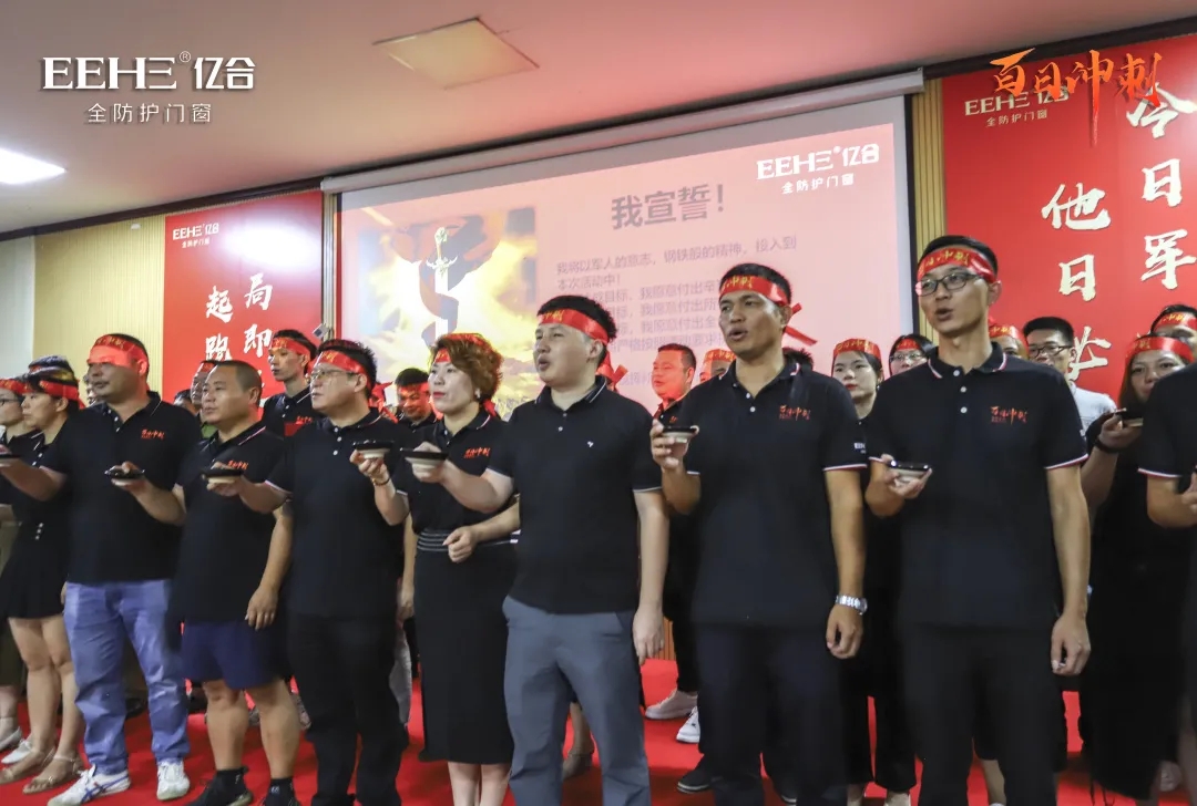 目標已鎖定,戰鼓已敲響!伴隨著氣勢磅礴的鼓聲,各經銷商戰士帶著必勝的決心,簽訂“軍令狀”,并激昂嘹亮地上臺宣誓并喝下壯行酒。錚錚誓言,響徹全場。“軍令狀”的簽訂,徹底吹響了百日沖刺的沖鋒號,激勵著億合門窗經銷商戰士們以更飽滿的熱情投入到終端銷售工作中,市場就是戰場,箭在弦上,即刻沖刺!