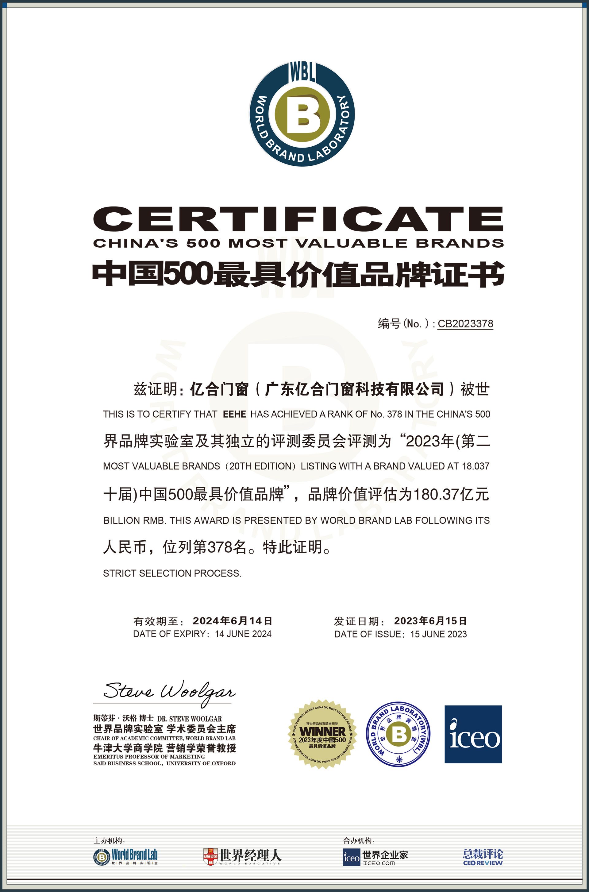 億合門窗再次與中國石油、騰訊、華為、五糧液、招商銀行等500家企業(yè)共同跨入“中國500最具價值品牌”陣營,不僅是權(quán)威機(jī)構(gòu)及社會各界對億合門窗的高度肯定,也充分體現(xiàn)了億合門窗強(qiáng)勁的品牌競爭力和良好的成長態(tài)勢,更是映射了過去一年來億合門窗穩(wěn)中有進(jìn)、一路向好的生動寫照與有力見證。