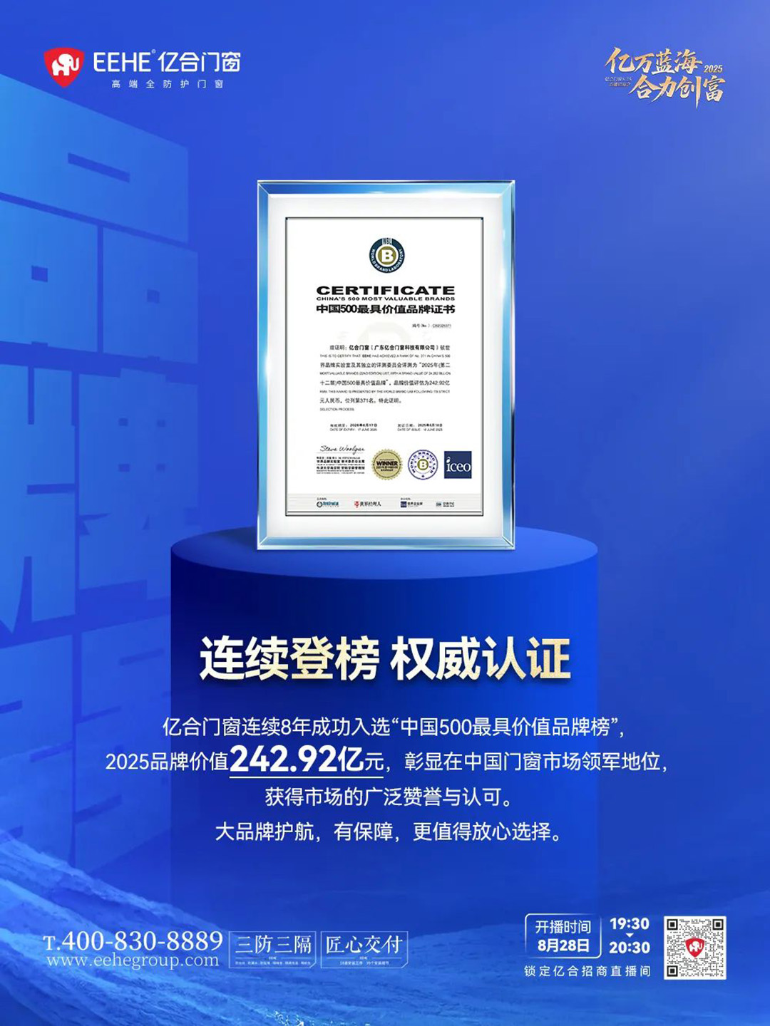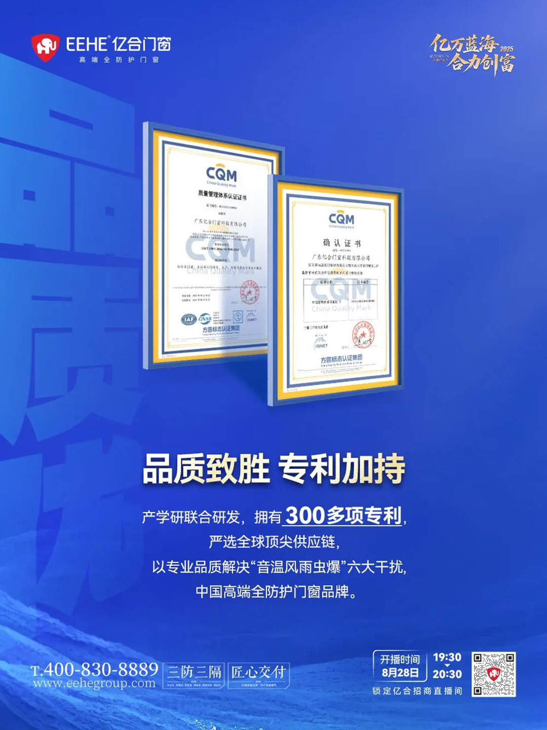 8月28日晚上19:30—20:30的直播招商會,將是一次不容錯過的財富機遇。在這場直播中,您將深入了解市場前景和億合門窗的品牌理念、產品優勢、加盟政策。無論您是初入行業的創業者,還是尋求轉型升級的門窗從業者,億合門窗都將為您提供一個實現財富夢想的平臺。抓住時代機遇,開啟全新財富之路,億合門窗誠邀您掃二維碼預約,提前鎖定“億合門窗”官方視頻號直播間,共同搶占萬億門窗市場,共創財富未來!