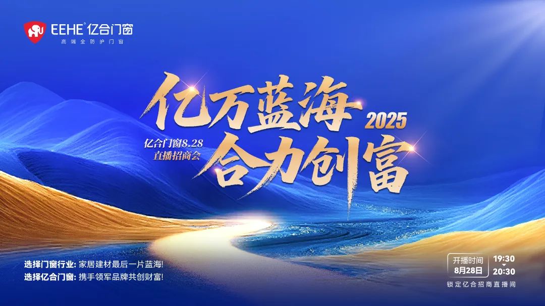 8月28日晚上19:30—20:30,“億萬藍海?合力創富”億合門窗8.28直播招商會即將火熱開啟。此次直播會將全面剖析門窗行業的發展趨勢,展示億合門窗的雄厚實力,并為廣大意向加盟商帶來極具吸引力的加盟政策、豐厚的惠商豪禮以及一系列互動驚喜,精彩內容,不容錯過!